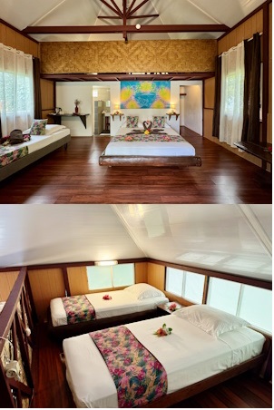 The Aute bungalow, the largest at the pension, can accommodate up to 10 guests across two floors. It features comfortable bedding and is furnished with coconut wood. Ideal for families or a stay with friends, it includes a bathroom with toilet and solar hot water, a living area, a desk, a wardrobe, a television, a fan, mosquito nets, a mini-refrigerator, and a covered terrace with outdoor seating.