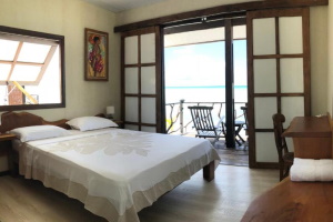 Seaview Bungalow: This bungalow, set slightly apart from the main house, is located on the lagoonfront with a white sandy beach just in front. The cosy interior features a king-size bed and a private bathroom with hot water. Ideal for couples.