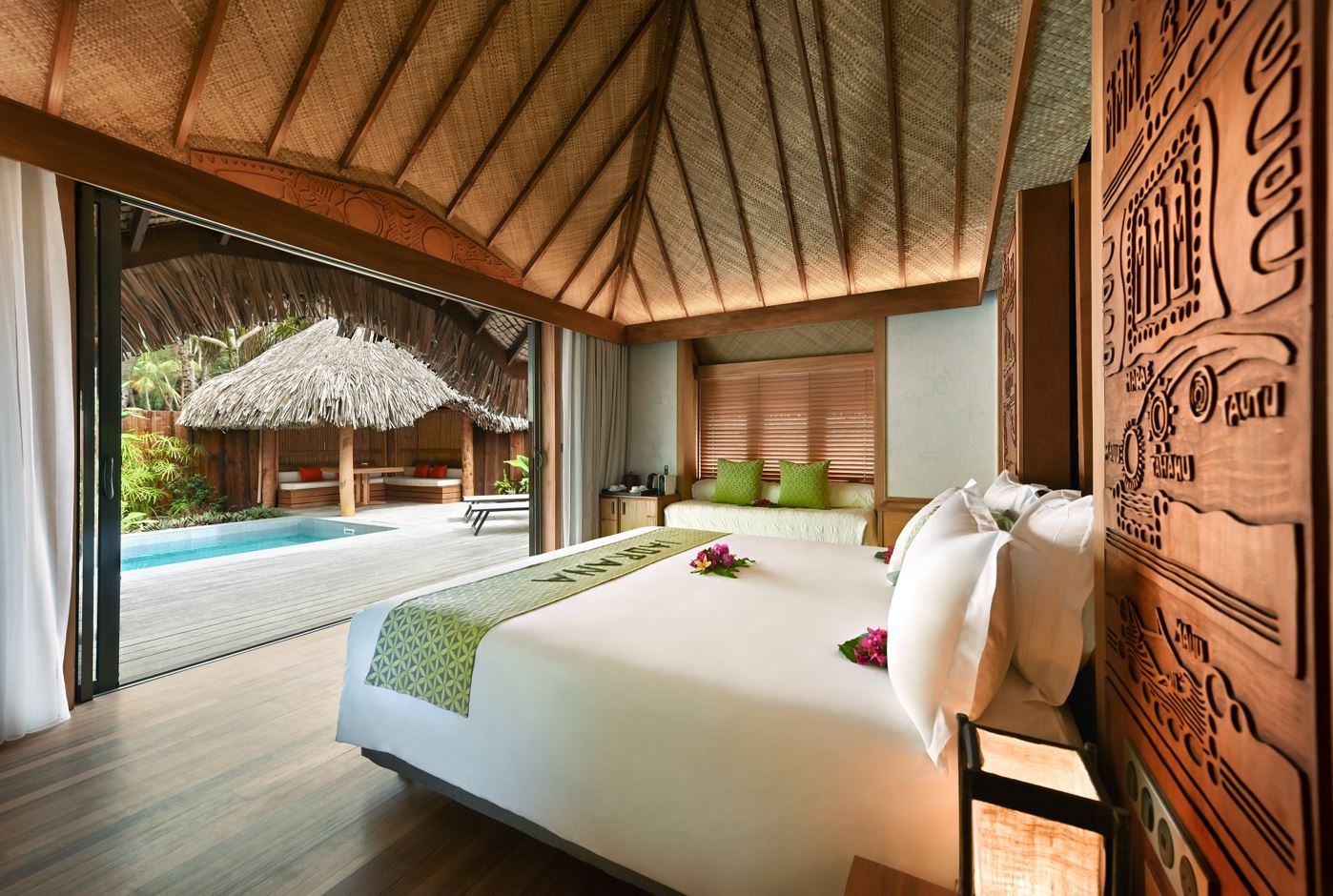 伝統的なポリネシアの「ファレ」(家)として建てられ、専用の庭園に囲まれた各ヴィラには、広々としたベッドルームエリア、屋内シャワー付きの専用バスルーム、プランジプールとガゼボ付きの広いサンデッキエリアが備わっています。.